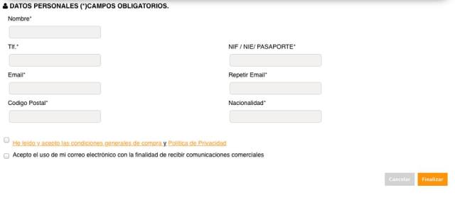 Druk op COMPRAR….prijs komt op en dan een scherm waar je je gegevens moet invullen, waaronder paspoort of NIE en je moet ook aanklikken dat je de generale regels accepteert (condiciones generales de compra) dan FINALIZAR. Daarna zal de betaling worden gevraagd met krediet kaart en als die bevestigd is komt de bevestiging van de reservering op die je moet printen. Succes!